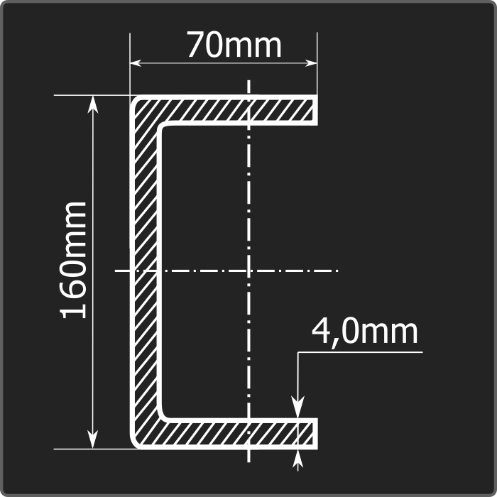 Швеллер стальной холоднокатаный гнутый равнополочный 160*70мм, толщиной 4,0мм и длиной 12м. Материал - углеродистая сталь. Соответствует требованиям ГОСТ 8278-83.