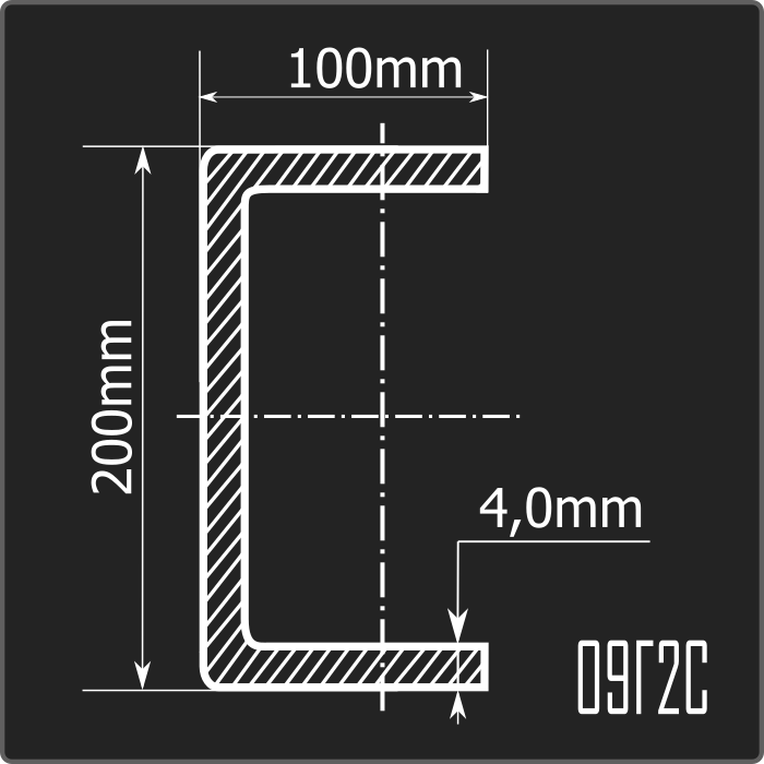 Швеллер стальной холоднокатаный гнутый равнополочный 200*100мм, толщиной 4,0мм и длиной 12м. Материал - низколегированная сталь. Соответствует требованиям ГОСТ 19281-2014.