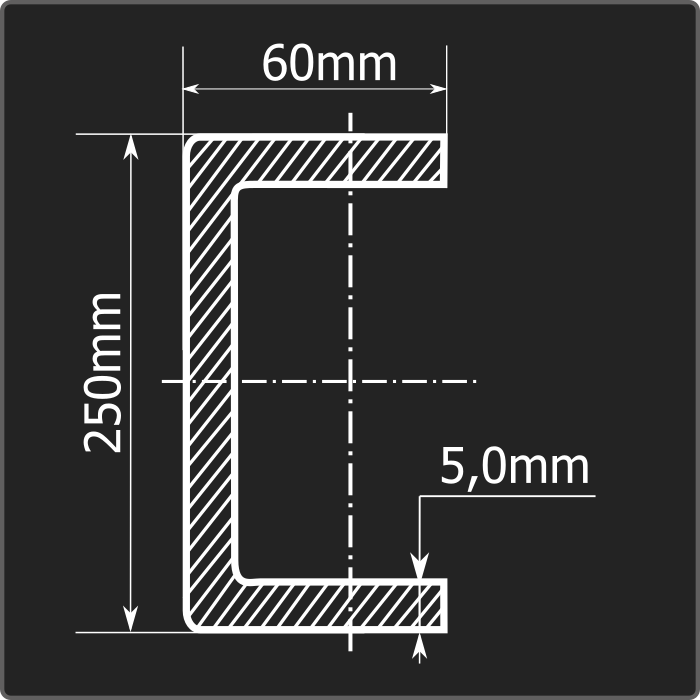 Швеллер стальной холоднокатаный гнутый равнополочный 250*60мм, толщиной 5,0мм и длиной 12м. Материал - углеродистая сталь. Соответствует требованиям ГОСТ 8278-83.