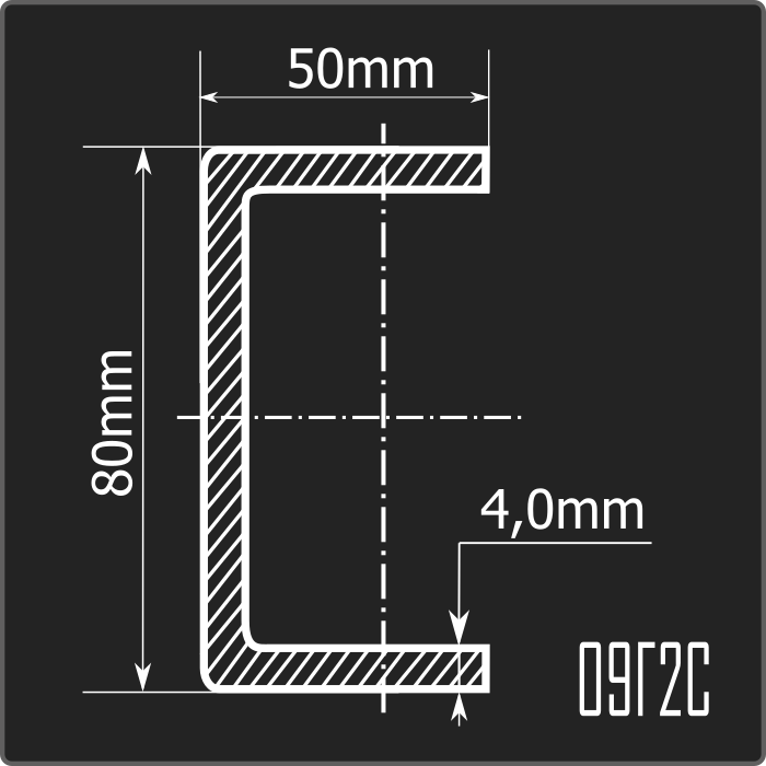 Швеллер стальной холоднокатаный гнутый равнополочный 80*50мм, толщиной 4,0мм и длиной 12м. Материал - низколегированная сталь. Соответствует требованиям ГОСТ 19281-2014.