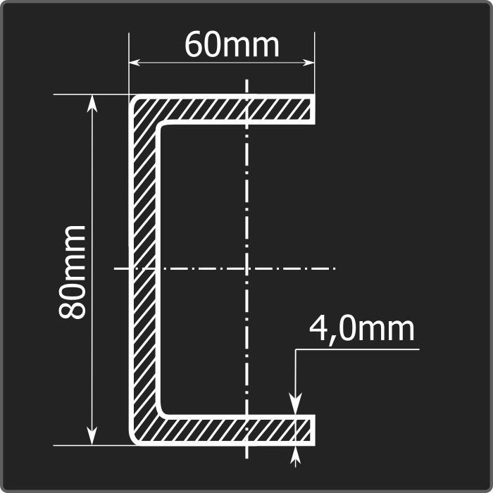 Швеллер стальной холоднокатаный гнутый равнополочный 80*60мм, толщиной 4,0мм и длиной 12м. Материал - углеродистая сталь. Соответствует требованиям ГОСТ 8278-83.