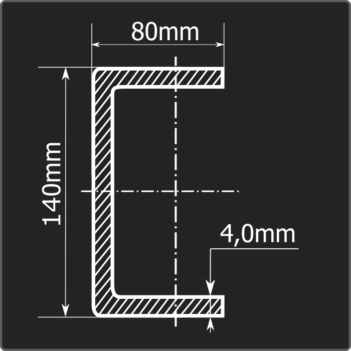 Швеллер стальной холоднокатаный гнутый равнополочный 140*80мм, толщиной 4,0мм и длиной 12м. Материал - углеродистая сталь. Соответствует требованиям ГОСТ 8278-83.