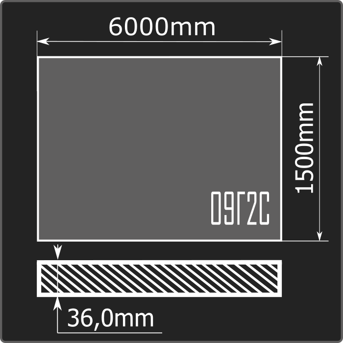 Лист стальной горячекатаный толщиной 36мм, шириной 1500мм и длиной 6000мм. Материал - низколегированная сталь. Соответствует требованиям ГОСТ 19281-2014.