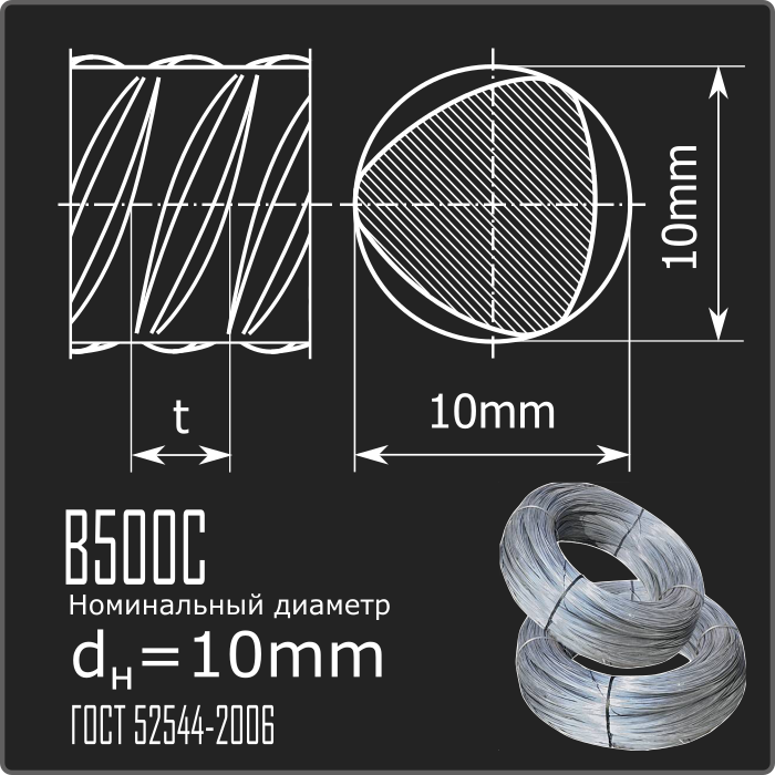 Арматурный прокат холоднодеформированный в мотках периодического профиля номинального диаметра dн 10,0мм класса В500 С (свариваемый). Расстояние между двумя соседними поперечными ребрами измеренное вдоль оси проката t = 6мм +/-15%. Соответствует требованиям ГОСТ 52544-2006.