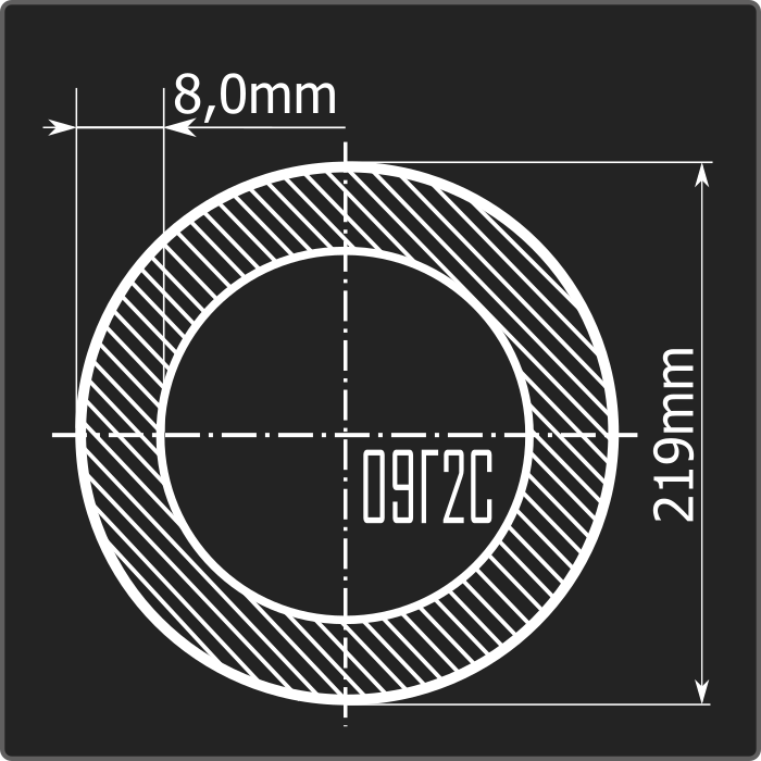 Труба электросварная стальная круглого сечения диаметром 219мм, толщиной 8,0мм и длиной 12м. Материал - низколегированная сталь. Соответствует требованиям ГОСТ 10705-80.