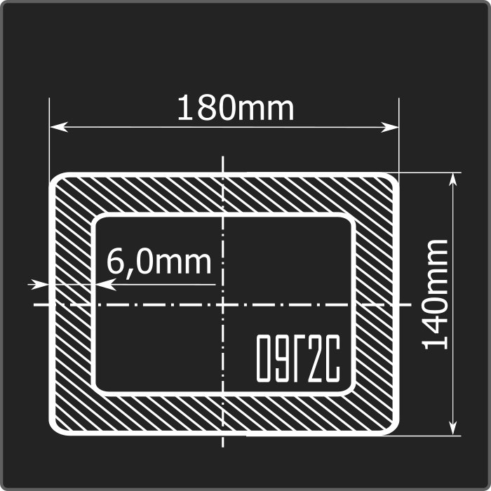 Труба профильная стальная прямоугольного сечения 180*140мм, длиной 12м и толщиной 6,0мм. Материал - низколегированная сталь. Соответствует требованиям ГОСТ 30245-2003. Стандартный пакет: вес - 5,342тн., количество - 16шт.