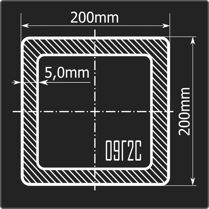 Труба профильная стальная квадратного сечения 200*200мм, длиной 12м и толщиной 5,0мм. Материал - низколегированная сталь. Соответствует требованиям ГОСТ 30245-2003.