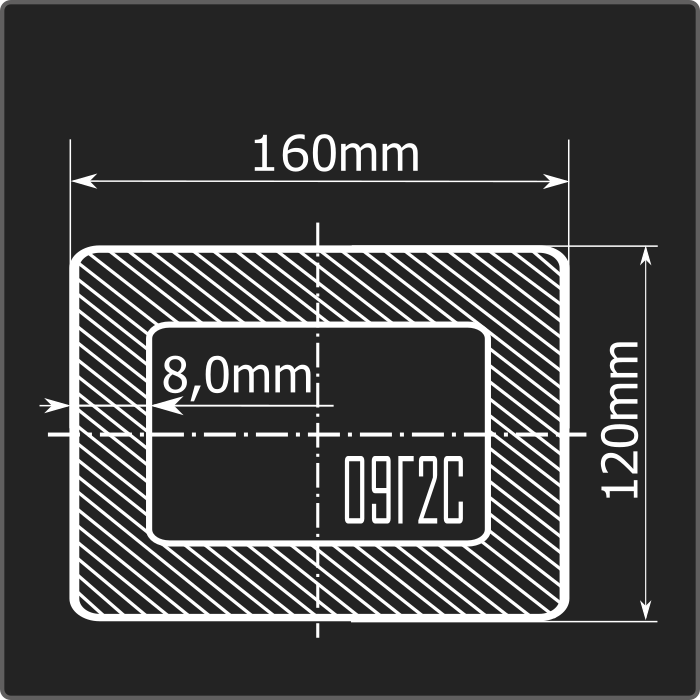 Труба профильная стальная прямоугольного сечения 160*120мм, длиной 12м и толщиной 8,0мм. Материал - низколегированная сталь. Соответствует требованиям ГОСТ 30245-2003.